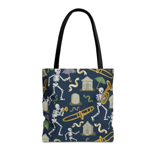 Skeleton Brass Band Tote Bag, New Orleans Graveyard Dancing Skeleton, Halloween Bag, Musician Gift, Jazz Lover Tote, Gothic Tote Bag