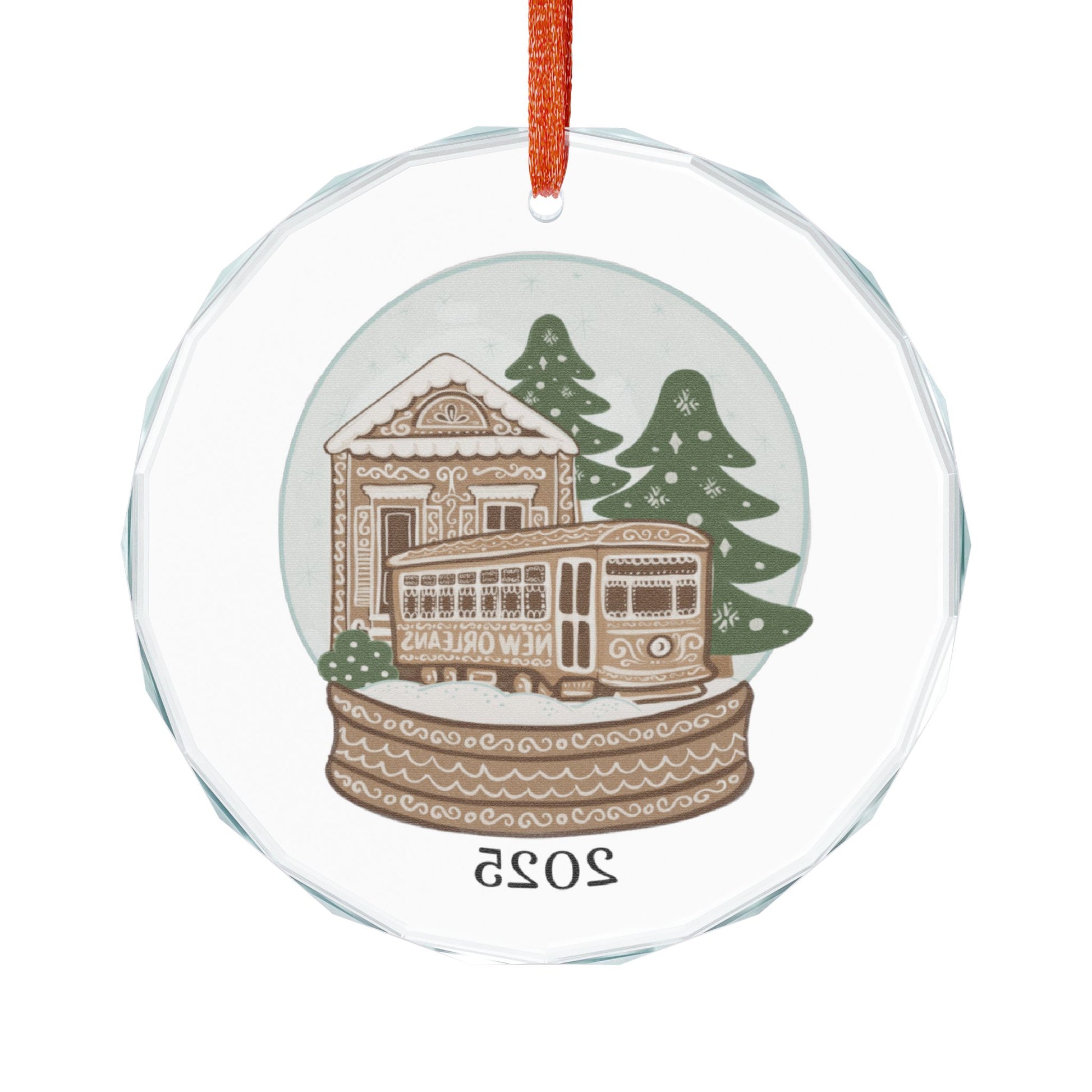 A faceted crystal ornament that catches light and keeps a small winter scene close at hand. The clear crystal—cut with a jewel-like edge—holds a single-sided printed snow globe illustration of a vintage streetcar in front of pine trees and a cozy house. Hung from its included red ribbon, it feels like a quiet, hand-tucked memory: a snowy evening, soft lights, and the gentle jolt of a tram slowing at the station. It adds a subtle sparkle to holiday décor, cabin windows, or a memory tree for grown-up collectors who love nostalgic transit and woodland motifs.